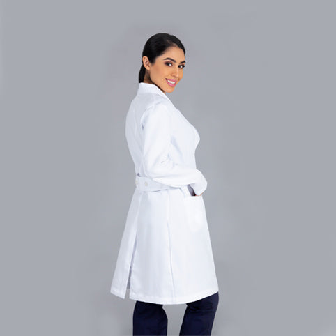 Bata clínica de mujer disponible en diferentes tallas. Uso clínico, para estudiantes universitarios que se encuentren en carreras afines a ciencias de la salud , para consultorios de medicina o relacionados.